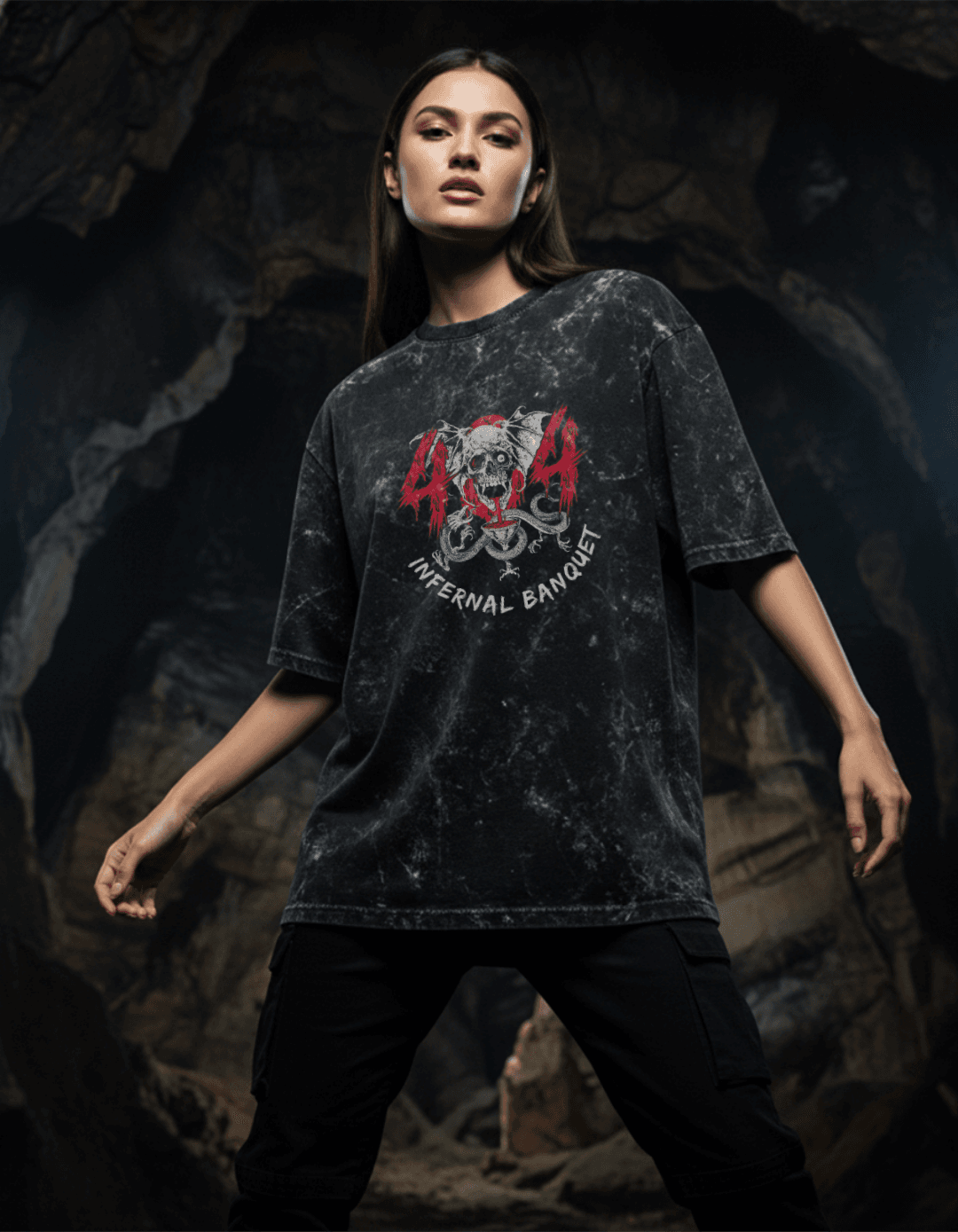 The 404 Infernal Banquet Oversized Acid Washed T-Shirt blends dark aesthetics with digital rebellion. Inspired by the idea of a system failure meeting forbidden indulgence, this design represents chaos, mystery, and unapologetic individuality.