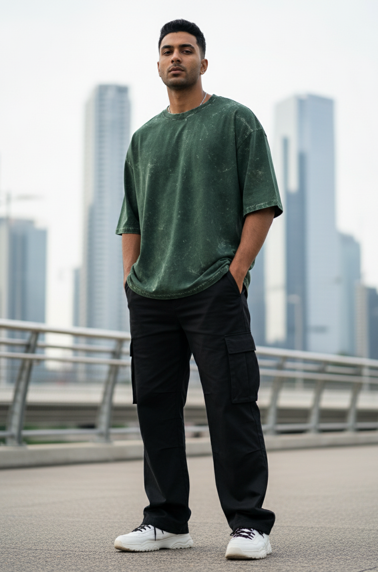The bottle green acid-washed finish creates a rugged, vintage-inspired texture that gives each T-shirt its own distinctive character. No two pieces look the same, making it a standout choice for anyone who appreciates individuality in their wardrobe. With pre-shrunk fabric, bio-washed smoothness, and a lycra ribbed neck, this oversized tee maintains its shape and quality wear after wear.