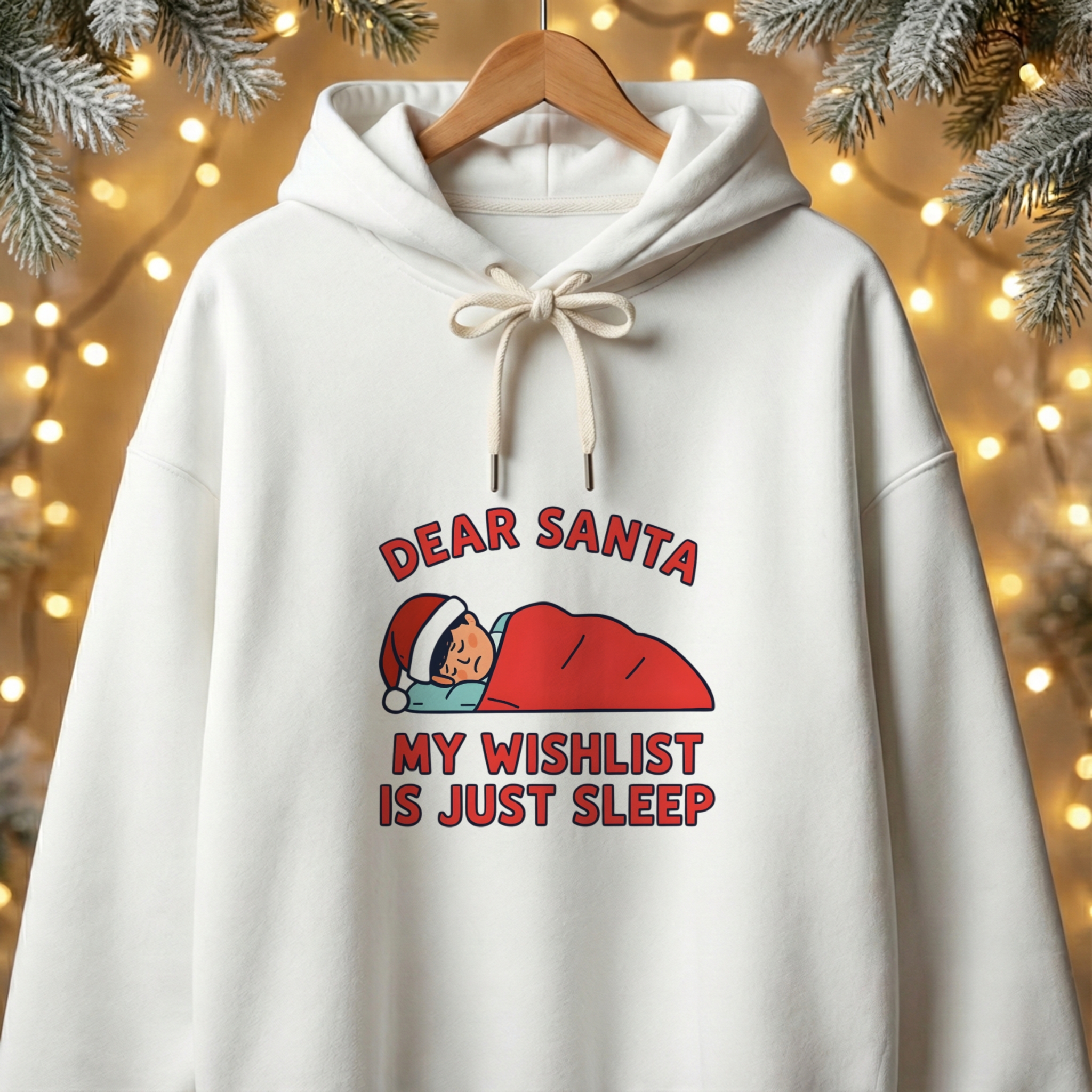 “Dear Santa My Wishlist Is Just Sleep” reimagines the classic letter to the North Pole with radical simplicity—one gift request above all: uninterrupted, guilt-free slumber amid holiday frenzy. It’s the exhausted adult’s ultimate fantasy, swapping material desires for the luxury of actual rest, turning sleep deprivation survival into a bold, honest holiday declaration.