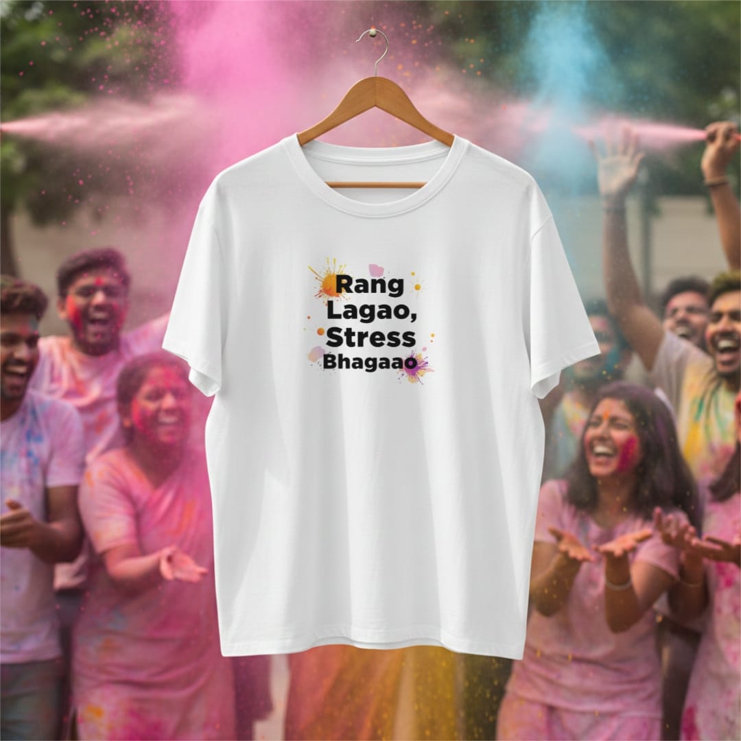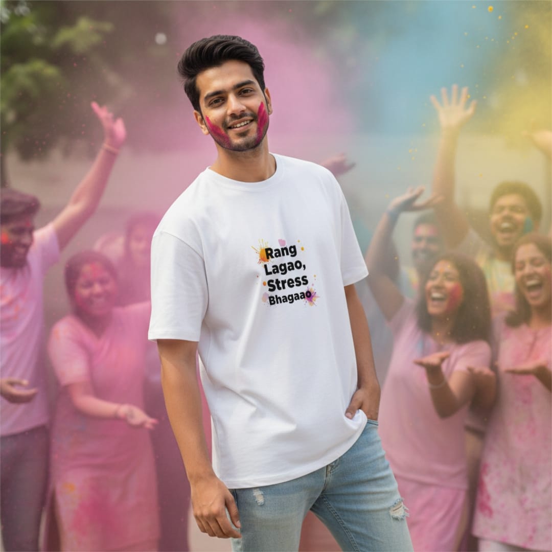 Add color to your life and remove the stress — that’s the spirit behind the RANG LAGAO STRESS BHAGAOO Oversized T-Shirt.