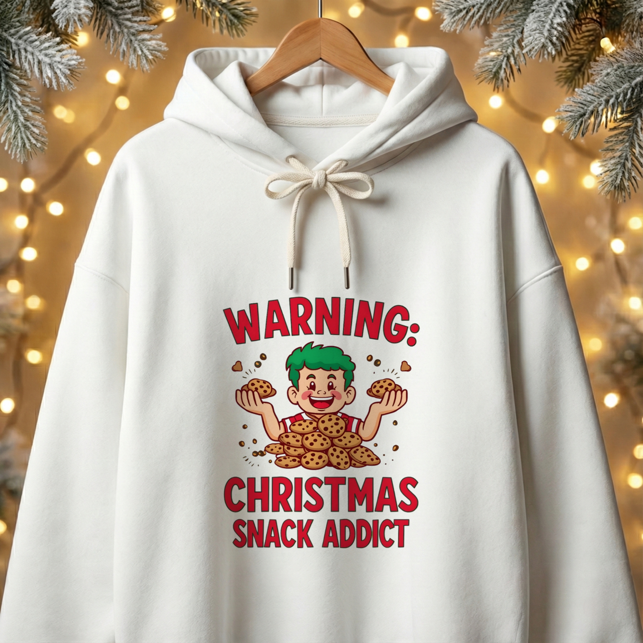 “Warning: Christmas Snack Addict” slaps a hazard label on the uncontrollable holiday munching frenzy—endless platters of cookies, chocolates, nuts, and mystery dips that turn December into a non-stop grazing gauntlet. It’s the self-aware confession for cookie monsters who treat festive treats like survival rations, owning snack domination with zero shame.